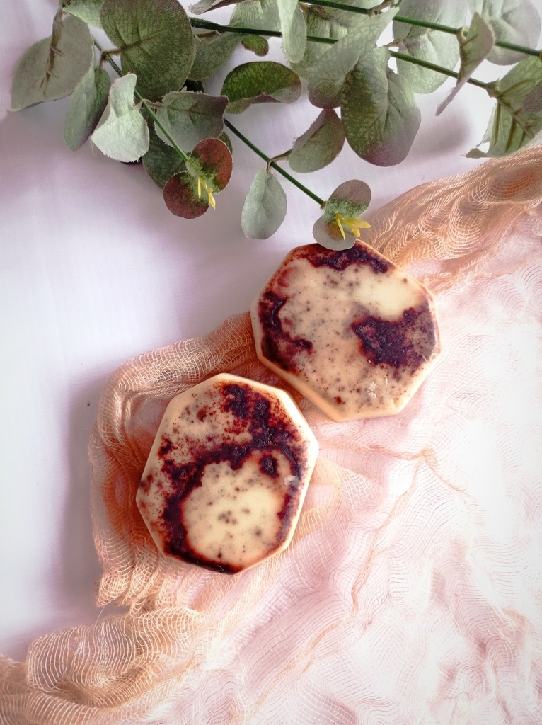 A magia da Natureza: base glicerinada, essência, óleo vegetal de semente de uva, extrato de aveia, pó de arroz e canela.