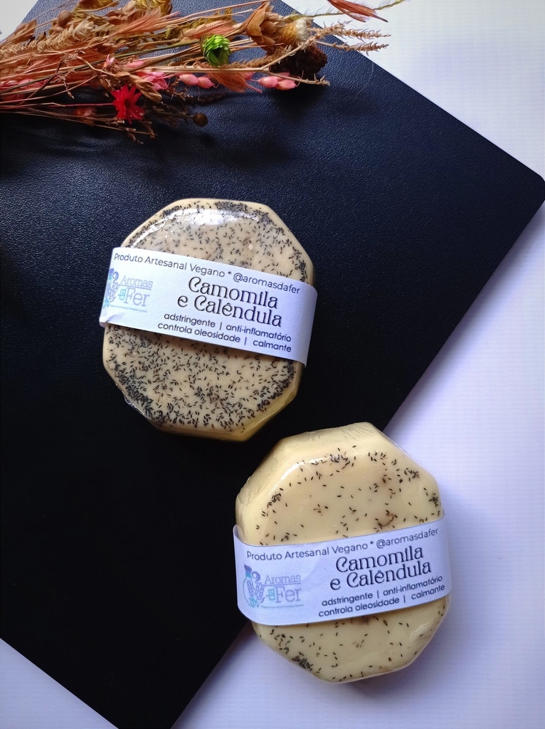 O sabonete de camomila e calêndula oferece benefícios calmantes e hidratantes para a pele.